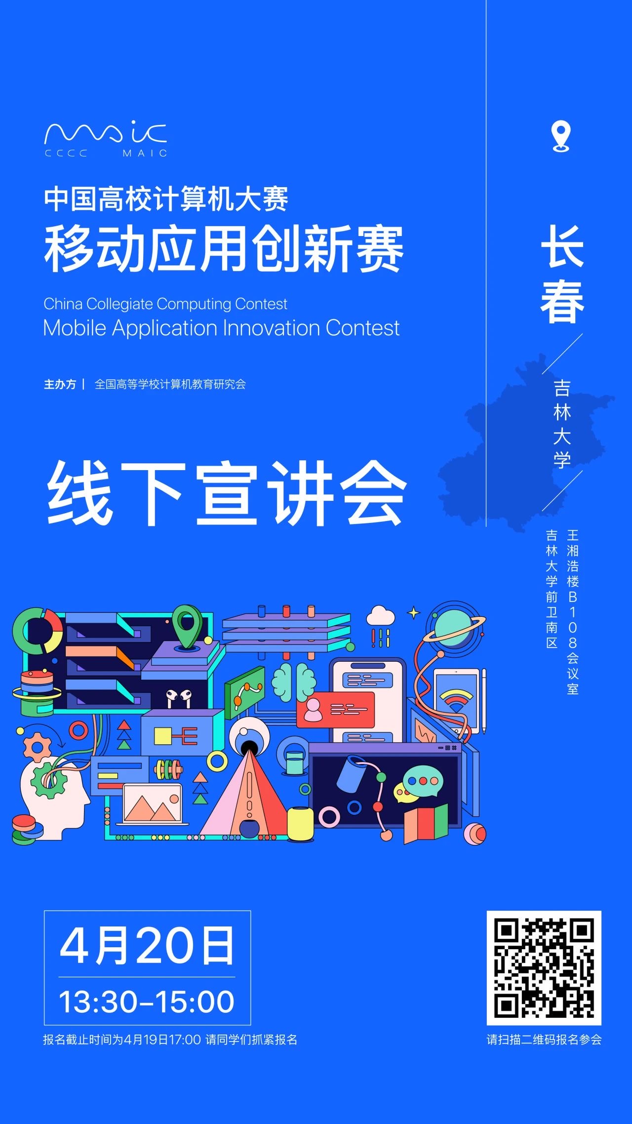 为了更好地组织推广移动应用创新赛,官方组委会在长春安排了一场宣讲会,选址在吉林大学前卫南区。此次宣讲会为官方性质,会带来更多作品案例分享,组委会老师也会在现场为大家答疑。