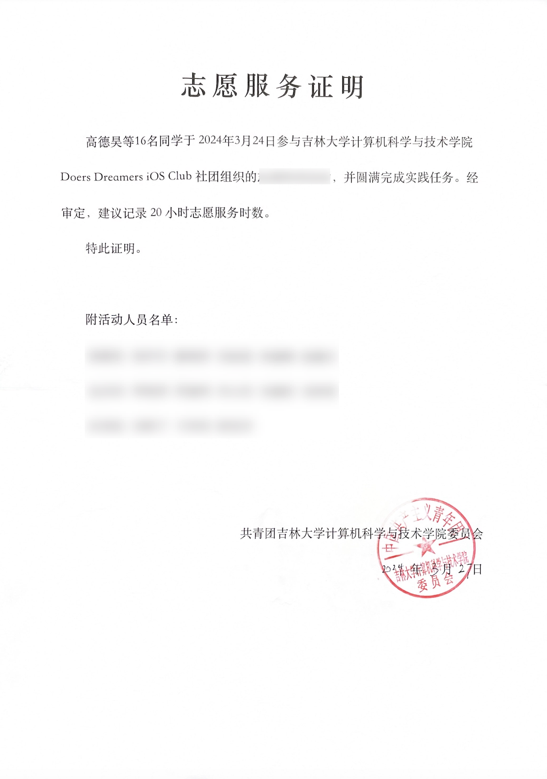 - 学院会为到场同学开取约 30 小时的志愿时长证明